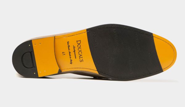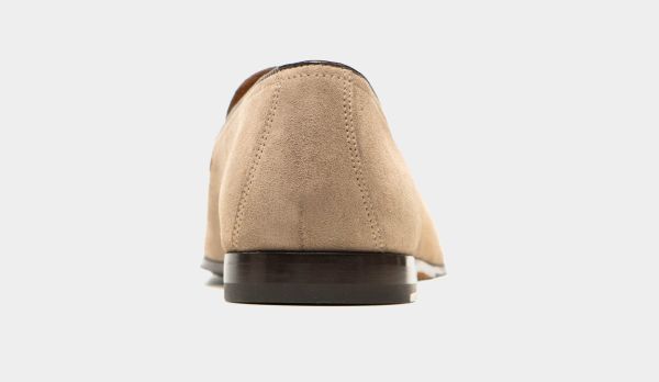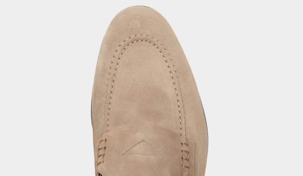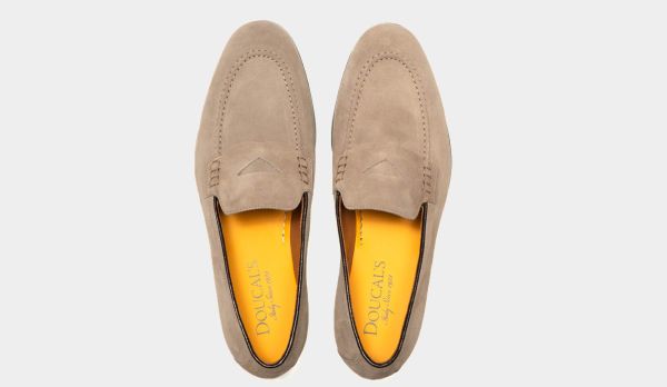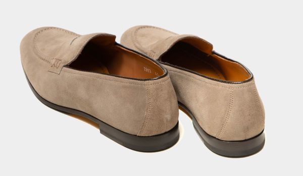 Crafted in luxurious taupe suede, these Doucals penny loafers boast a tapered silhouette and timeless styling. Featuring 'sacchetto' construction and apron detailing, they are meticulously designed for both elegance and comfort. The 'sacchetto' construction method is a technique that allows for the creation of particularly comfortable footwear. This manufacturing process, following the standards of the most authentic Italian shoemaking tradition, involves steps that require great skill, experience, and expertise. Sacchetto refers to ‘small bag’, so it feels like a slipper, yet appears like a shoe that may be worn outside. During the stitching phase, the leather lining is attached like a “bag” along the edge, enabling the construction of a shoe without the rigid components used in most shoes. Stitching on shoes with this construction allows us to remove all of those inflexible features and make soft slipper-like shoes that look just as nice as your favorite shoe. Once the upper, lining, and insole are stitched together, the shoe is pulled over a shoe last, which is a form in the shape of a foot. The shoe is carefully stretched and secured onto the last, to maintain its shape during the final stages of production. The shoe is then subjected to a heating process that helps it maintain its form. Finished with a leather sole in the brand's signature Golden Cream hue, complete with a rubber half insole for added traction.