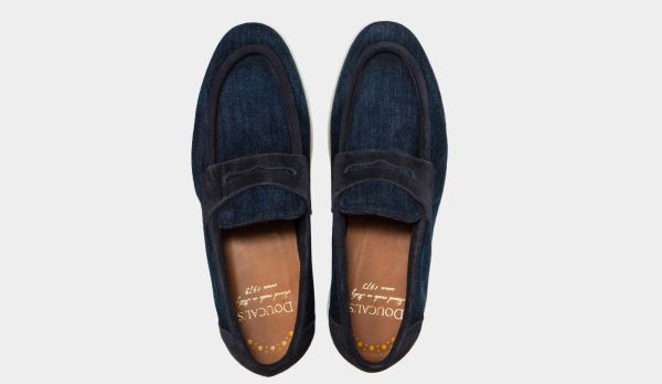 Casual elegant, blue summer Doucals loafers, made from suede and denim with comfortable, light weight, white technical rubber sole. Great with a white pair of cotton 5-pocket or slacks and a blue