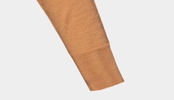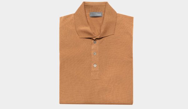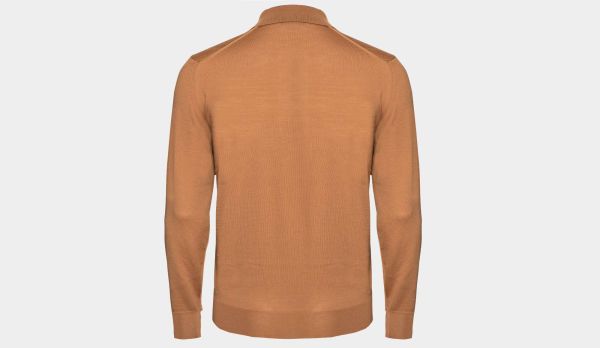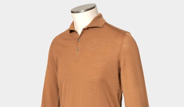 Light weight, superfine 140S woolen polo in caramel color from Drumohr. Made in Italy luxury basic for colder days. An S number on the label of wool suits or other tailored apparel, wool fabric, or yarn, indicates the fineness of the wool fiber used in the making of the apparel, as measured by its maximum diameter in micrometres. Fiber fineness is one of the factors determining the quality and performance of a woolen product.